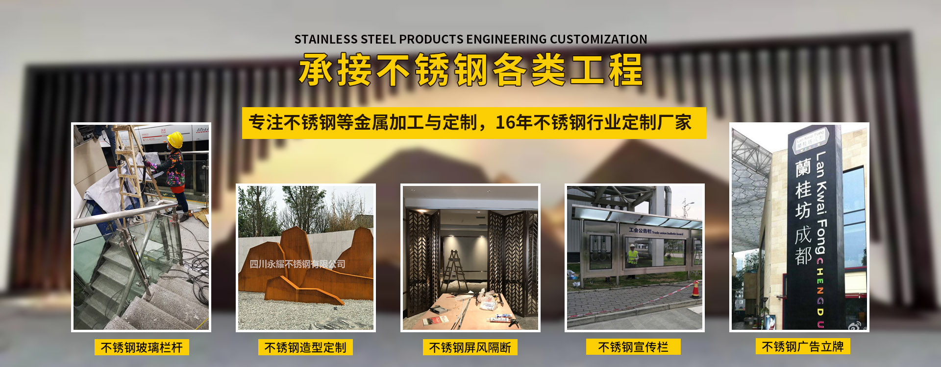 四川永耀不銹鋼有限公司是一家集開發(fā)、設(shè)計、加工、制作、安裝、并承接各種不銹鋼工程為一體的綜合性企業(yè)。多年來一直在專注于不銹鋼等金屬的加工與研發(fā)。在客戶群體中贏得了良好的聲譽,以專業(yè)專注的精神,致辭力于打造良好的產(chǎn)品和企業(yè)形象,對每一產(chǎn)品傾注全力,力爭每個細節(jié)精細,確保產(chǎn)品具有優(yōu)越的性能,優(yōu)美的外觀及優(yōu)良的品質(zhì),使公司產(chǎn)品深受廣大用戶的親睞。 本公司主要業(yè)務(wù): 一、工程類 承攬:酒店、銀行、商鋪、寫字樓、公寓、城鐵、地鐵、公交、機關(guān)、 學校、廣場藝術(shù)雕塑、自動門、旋轉(zhuǎn)門、廣告欄、公
